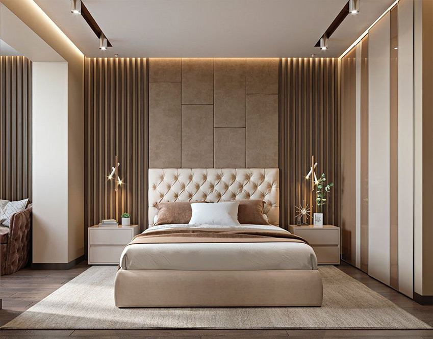 Our experts have created a master bedroom with patterned carpets, paintings, calligraphy, stunning furniture, plush mirrors and more.